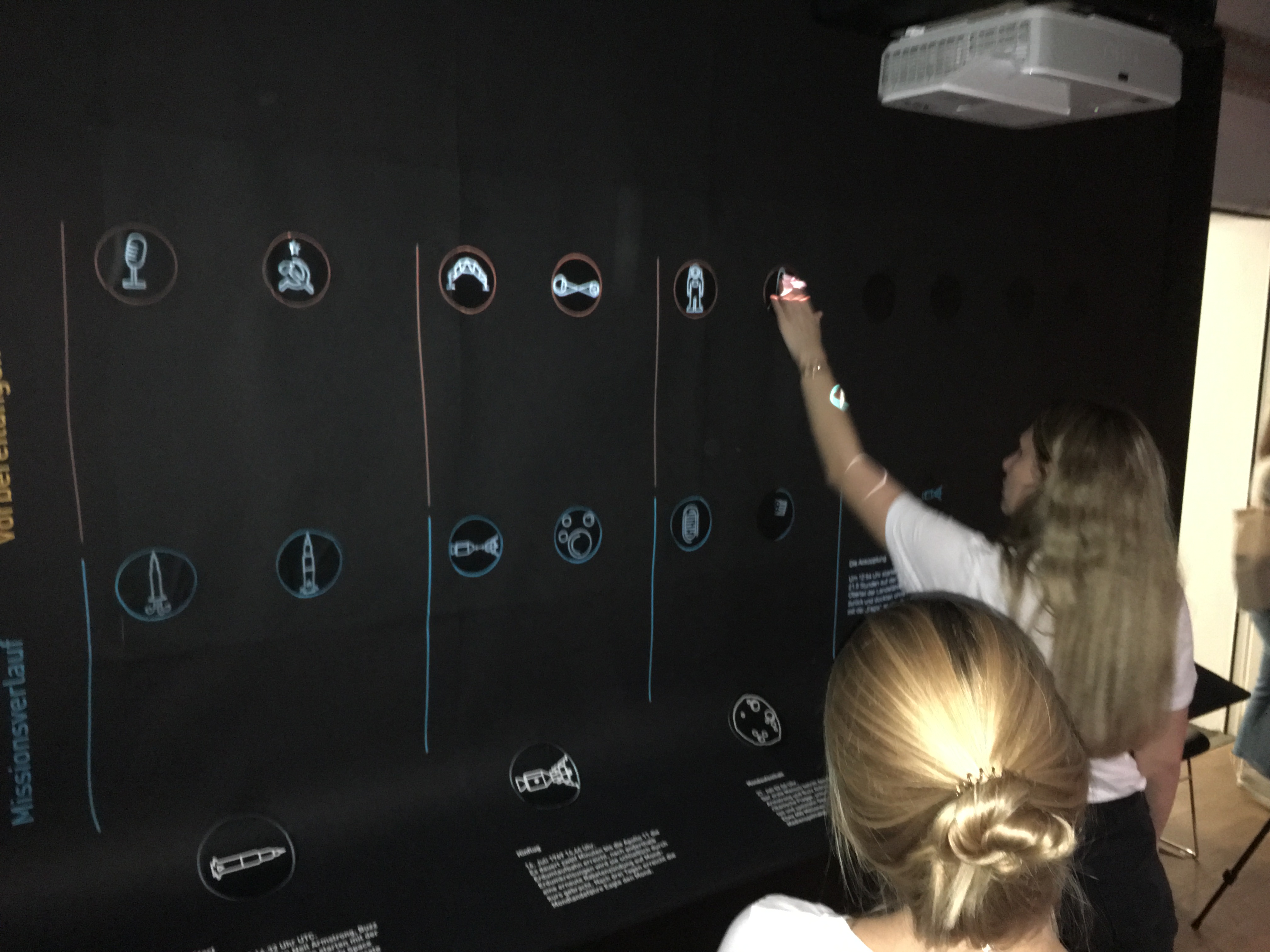Das Research wurde in zwei Teile aufgeteilt. Der erste Teil war der tatsächliche Inhalt, welchen wir präsentieren wollten, vom Start der Rakte bis zur Landung der Kapsel wieder auf der Erde. Hierbei gab es schon genug Stationen, jedoch auch die Ereignisse, welche während des Fluges auf der Erde vor, nach und während dem Flug stattfanden waren für uns relevant. Derzweite Part des Researches war zu einem großen Teil meine Aufgabe, da ich selbst sehr technikaffin bin war es damals meine Aufgabe, die Probleme der Darstellung und ihrer Art zu lösen. Hierfür untersuchte ich die gegebenen Mittel der HFG (Projektoren, Projezierflächen, programmierbare Geräte ect.) und machte daraus meinen Teamkollegen die Vorschläge aus denen sich die interaktive Wand dann letztendlich kristallisierte.